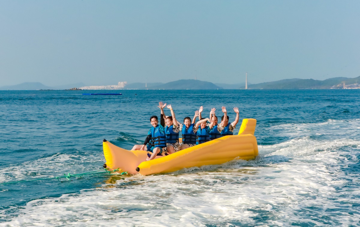 Nếu bạn đi theo nhóm bạn hoặc gia đình và muốn tìm một trò chơi biển đầy ắp tiếng cười và cảm giác mạnh,phao chuối là lựa chọn hoàn hảo. Bạn và những người bạn sẽ cùng ngồi lên chiếc phao hình quả chuối khổng lồ, được kéo bởi một chiếc cano cao tốc lướt trên mặt biển.