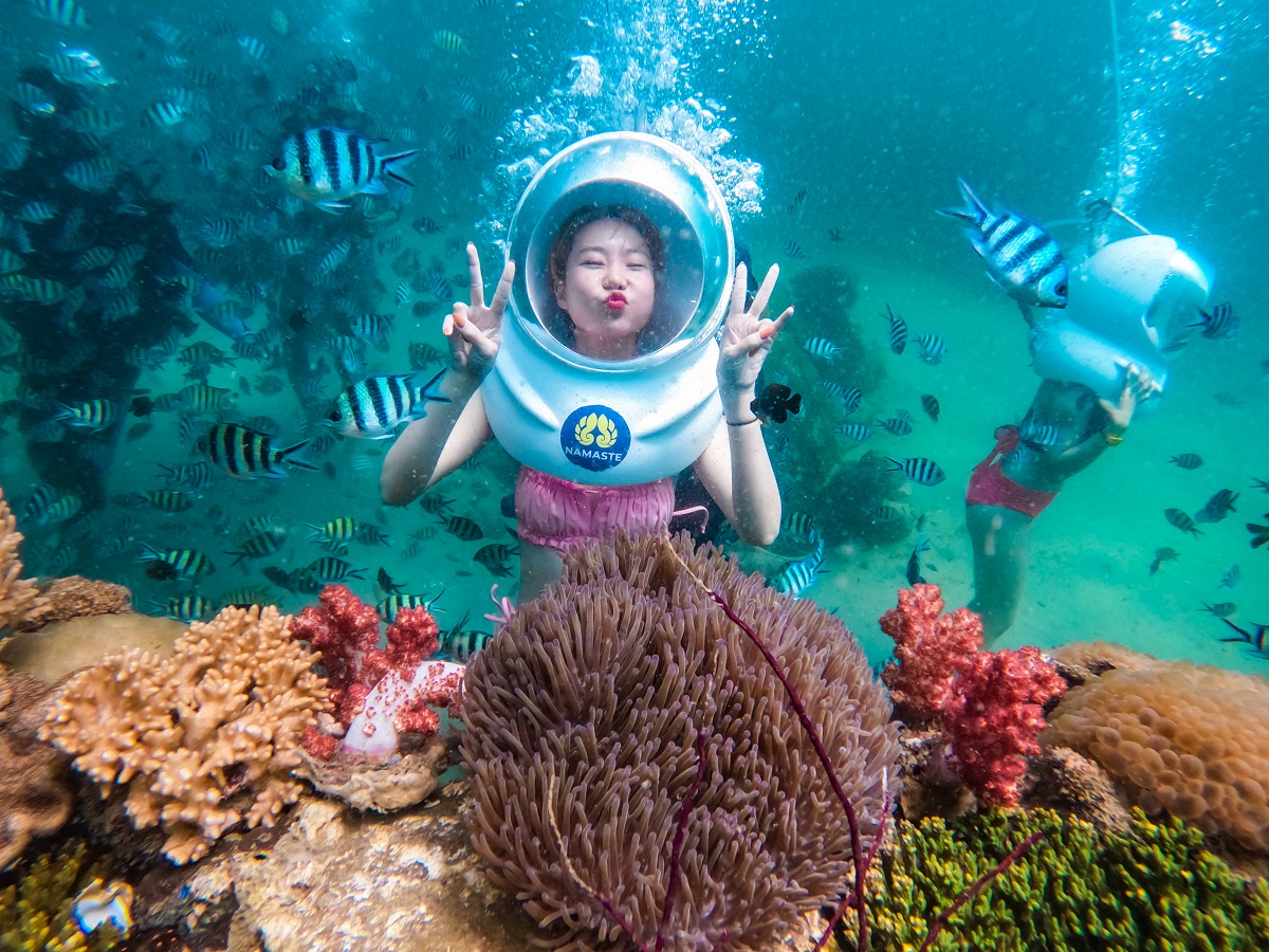 Không dừng lại ở việc chiêm ngưỡng biển từ trên mặt nước, du thuyền còn là cánh cửa mở ra một thế giới khác, thế giới nằm sâu dưới làn nước trong xanh ấy, nơi bạn có thể bước xuống và… đi bộ. Sea Walking, hay còn gọi là đi bộ dưới đáy biển, là trải nghiệm độc đáo chỉ có tại một vài điểm đến cao cấp trên thế giới, và Phú Quốc là một trong số đó. Chỉ cần đội chiếc mũ dưỡng khí đặc biệt, bạn sẽ có thể thở dưới nước như trên cạn để rồi sau đó từng bước đặt chân xuống đáy đại dương, nơi những rạn san hô đầy màu sắc đang tỏa sáng dưới ánh nắng xuyên qua mặt nước, những đàn cá lấp lánh bơi lượn quanh người, như thể bạn đang trở thành một phần của đại dương bao la. Không cần biết bơi, không cần kỹ năng đặc biệt, bạn vẫn có thể cảm nhận được sự sống dưới biển bằng cách gần gũi và tự nhiên nhất. Đó là một thế giới yên tĩnh, thanh bình và kỳ ảo, trái ngược hẳn với mặt đất ồn ào náo nhiệt, có thể nói đây sẽ là một trải nghiệm khiến nhiều người ngỡ như đang mơ giữa ban ngày.