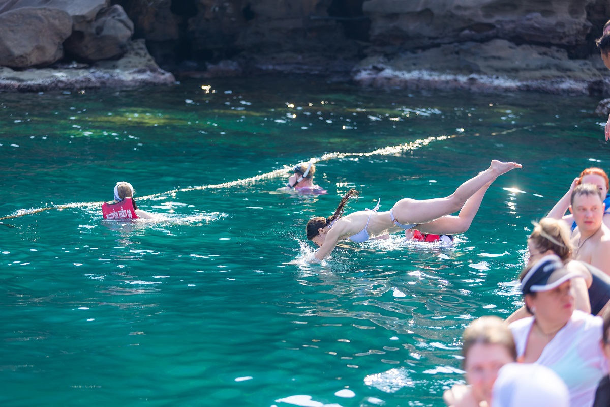 - Bơi lội, tắm biển tại khu vực an toàn: Đừng bỏ lỡ trải nghiệm tắm biển tại Phú Quốc, nơi làn nước trong vắt đến mức có thể nhìn thấy cả đàn cá bơi lượn ngay dưới chân. Một khoảnh khắc ‘đáng đồng tiền bát gạo’ không thể thiếu khi đến Phú Quốc! Khu vực tắm biển cũng đã được Namaste kiểm duyệt và nghiên cứu kỹ lưỡng trước khi thả neo và sẽ luôn cứu hộ xung quanh vậy nên đừng bỏ lỡ nhé.