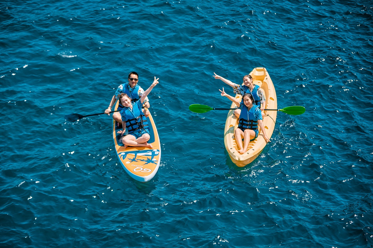 Dành cho team muốn tận hưởng sự yên bình, riêng tư nhưng vẫn muốn có loạt ảnh đẹp mang về thì nhất định phải check in trên ván SUP hoặc Kayak nhé. Bạn có thể tự do khám phá những góc khuất của hòn đảo, ngắm nhìn hệ sinh thái biển từ một góc độ khác. Đừng quên mang theo điện thoại chống nước để lưu giữ mọi khoảnh khắc đáng yêu này!