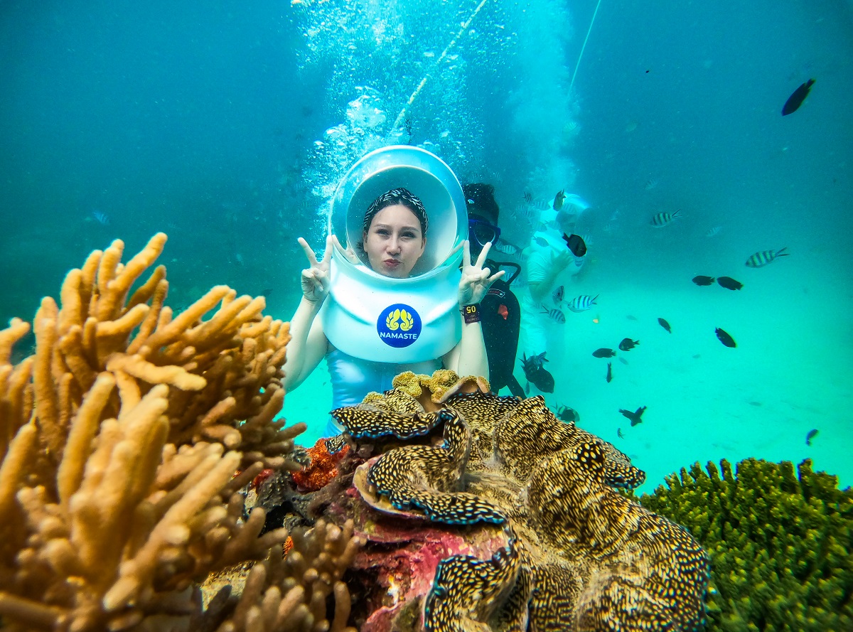 Đây là một trải nghiệm “must-try” dành cho tất cả mọi người, kể cả những ai không biết bơi! Trước khi xuống nước, bạn sẽ cần đội một chiếc mũ “phi hành gia” cung cấp oxy để có thể hít thở bình thường như trên cạn! Trải nghiệm đi bộ bên cạnh đàn cá bơi lội xung quanh cùng với những rạn san hô đủ màu sắc hiện ra ngay trước mắt bạn sẽ khiến bạn phải rung động trước mẹ thiên nhiên. Một thế giới đại dương kỳ diệu sẽ mở ra trước mắt bạn mà không cần bất kỳ kỹ năng lặn chuyên nghiệp nào.