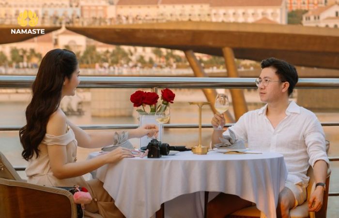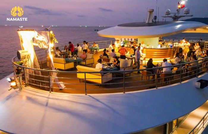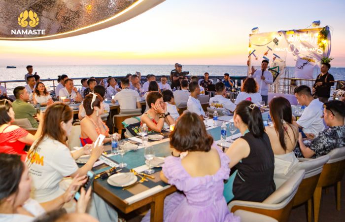 Không gian sang trọng, boong rộng và view hoàng hôn 360° giúp bạn có một buổi tiệc ấn tượng. Namaste hỗ trợ setup trang trí, bánh kem, hoa, champagne, bàn tiệc riêng theo nhu cầu.