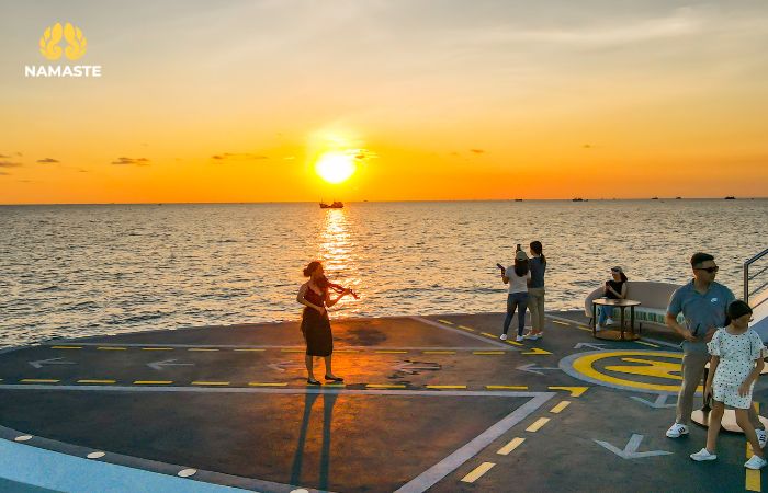 Hành trình bắt đầu khi đội xe Namaste đến đón bạn tại khách sạn. Trên đường di chuyển về bến cảng, du khách có thời gian thư giãn, chuẩn bị tâm trạng thật thoải mái để bước vào chuyến du ngoạn ngắm hoàng hôn đầy cảm xúc.