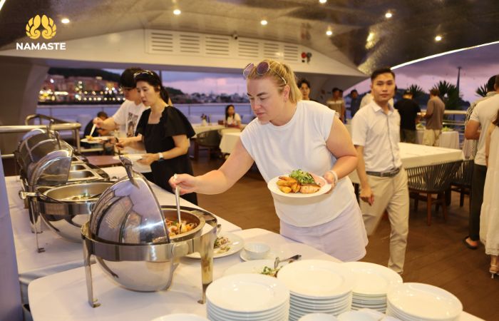 Có. Du khách sẽ thưởng thức buffet tối phong phú, đa dạng món Á – Âu, hải sản và nhiều lựa chọn cho trẻ em.